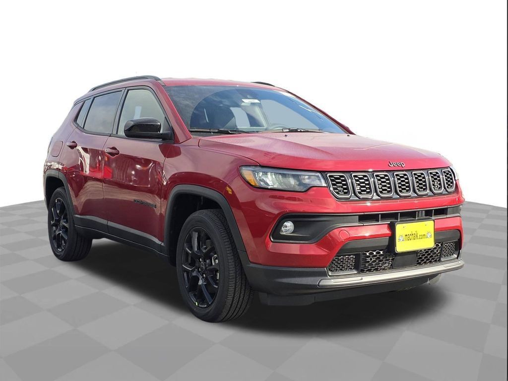 red hot pearlcoat 2026 Jeep Compass Latitude 4WD 8-Speed Automatic 2.0L I4 DOHC 4WD.This 2026 Jeep Compass Latitude in red hot pearlcoat includes the following features: 2.0L I4 DOHC 8-Speed Automatic 4WD Quick Order Package 29N Altitude (10.1" Touchscreen Display, Altitude Special Edition, Black Day Light Opening Moldings, Gloss Black Surround/Neutral Gray Rings, Neutral Gray Exterior Badging, Piano Black Interior Accents, Sliding Sun Visors with Illuminated Mirrors, and Wheels: 18" x 7" Gloss Black Painted Aluminum), 4WD, 17" x 7" Aluminum Wheels, 3.73 Final Drive Ratio, 4-Wheel Disc Brakes, 4G LTE Wi-Fi Hot Spot, 6 Speakers, ABS brakes, Air Conditioning, AM/FM radio: SiriusXM, Auto High-beam Headlights, Automatic temperature control, Bluetooth Handsfree Phone and Audio, Brake assist, Bumpers: body-color, Compass, Delay-off headlights, Driver door bin, Driver vanity mirror, Dual front impact airbags, Dual front side impact airbags, Electronic Stability Control, Emergency communication system: SiriusXM Guardian, Four wheel independent suspension, Front anti-roll bar, Front Bucket Seats, Front Center Armrest w/Storage, Front fog lights, Front License Plate Bracket, Front reading lights, Fully automatic headlights, Global Telematics Box Module, Heated door mirrors, Heated front seats, Heated steering wheel, Illuminated entry, Knee airbag, Leather Shift Knob, Leather steering wheel, Low tire pressure warning, Manufacture Statement of Origin, Occupant sensing airbag, Outside temperature display, Overhead airbag, Overhead console, Panic alarm, ParkView Rear Back-Up Camera, Passenger door bin, Passenger vanity mirror, Power door mirrors, Power steering, Power windows, Premium audio system: UConnect 5, Premium Cloth/Vinyl Bucket Seats, Radio: Uconnect 5 with 8.4" Display, Rear anti-roll bar, Rear seat center armrest, Rear window defroster, Rear window wiper, Remote keyless entry, Security system, SiriusXM Satellite Radio, Speed control, Split folding rear seat, Spoiler, Steering wheel mounted audio controls, Tachometer, Telescoping steering wheel, Tilt steering wheel, Traction control, Trip computer, and Variably intermittent wipers. 23/31 City/Highway MPG Price does not include tax, title, and license: $1000 - 2026 National Retail Bonus Cash . Exp. 03/31/2026